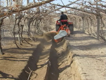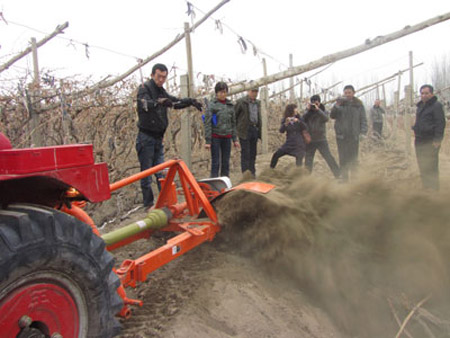 開溝埋藤機勞動強度大、作業時間緊、質量要求高。開溝埋藤這項繁重的勞動一直是由人工完成,作業質量差,效率低,成本高,已嚴重制約了生產的發展。 我單位的專利產品:前行走行間取土雙側開溝埋藤的研制成功,不僅大幅度提高了埋藤作業效率和作業質量,而且大幅度降低了勞動強度和作業成本,同時解決了不同種植行距作業的問題,可適用于大于150CM以上的種植行距,不受行距和地塊大小的限制,適用范圍廣,此專利填補了國內空白。